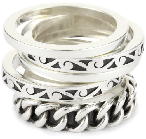 Make a statement of style and individuality with the LOIS HILL "Classics" 5 Stack Link Band Ring. In this set, five different rings come together for an amalgam of texture, details and simplicity. A solo link chain ring rocks a singular texture and accompanies two rings with scrolling details and two plain sterling silver rings that provide a necessary break from the textural action. These rings can be worn separately or in concert to create a totally unique look. If you like sterling silver, then you really can't afford to not have this set.